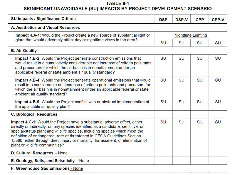 Table 6-1 identifies the significant impacts of proposed Project Site development, while the table on page 6-20 identifies cumulative, rather than Baylands Project site development impacts. As discussed in the conclusion on page 4.C-47, implementation of Mitigation Measures 4.C-1g, 4.H-1a, 4.H-1b, and 4.H-4 would reduce Impact 4.C-1 to less than significant. Table 6-1 is therefore revised to read as follows: